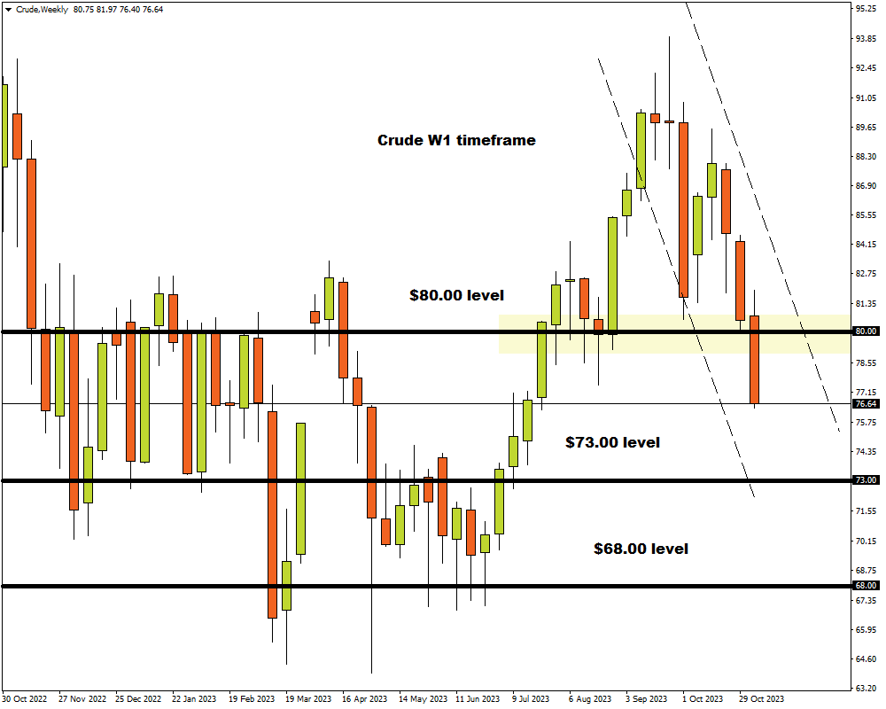 Zooming out to the weekly charts, we see a similar bearish picture with crude on the path to securing its third negative trading week. Prices have broken through the $80 weekly support with the next key level of interest on the W1 timeframe around $73 and $68.