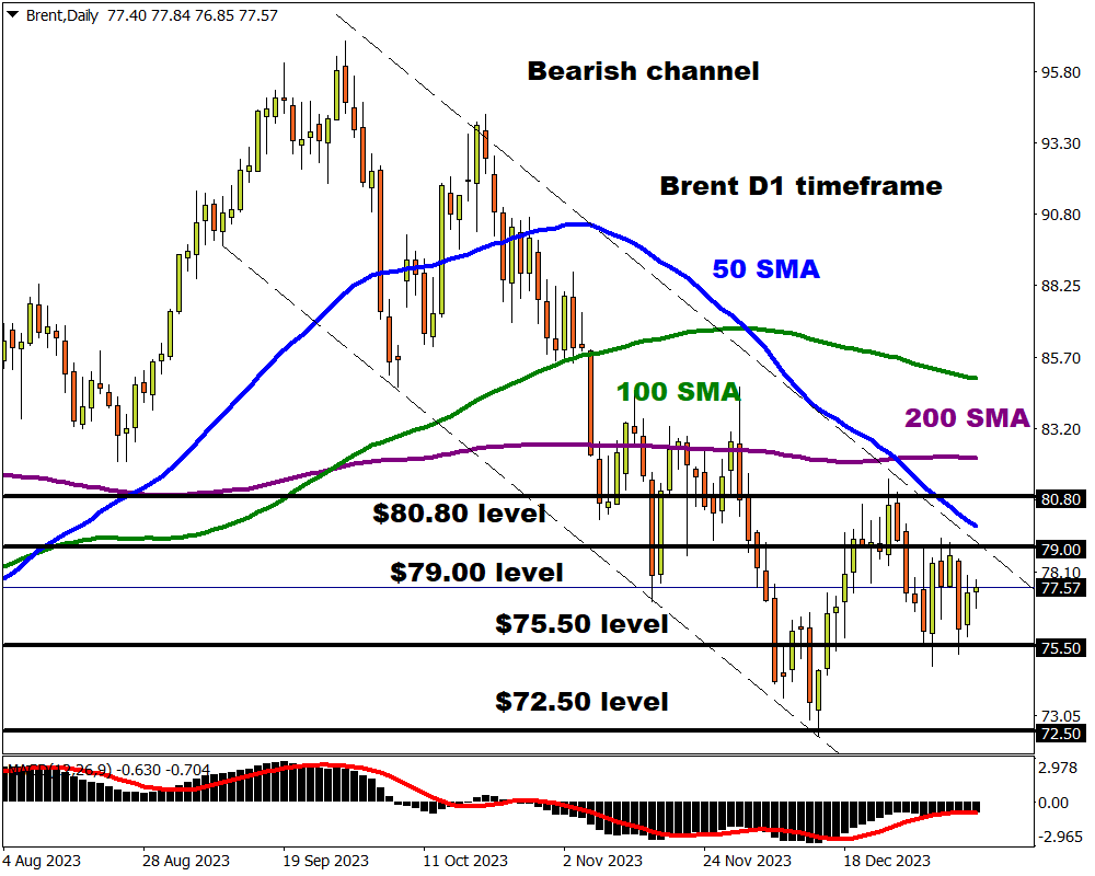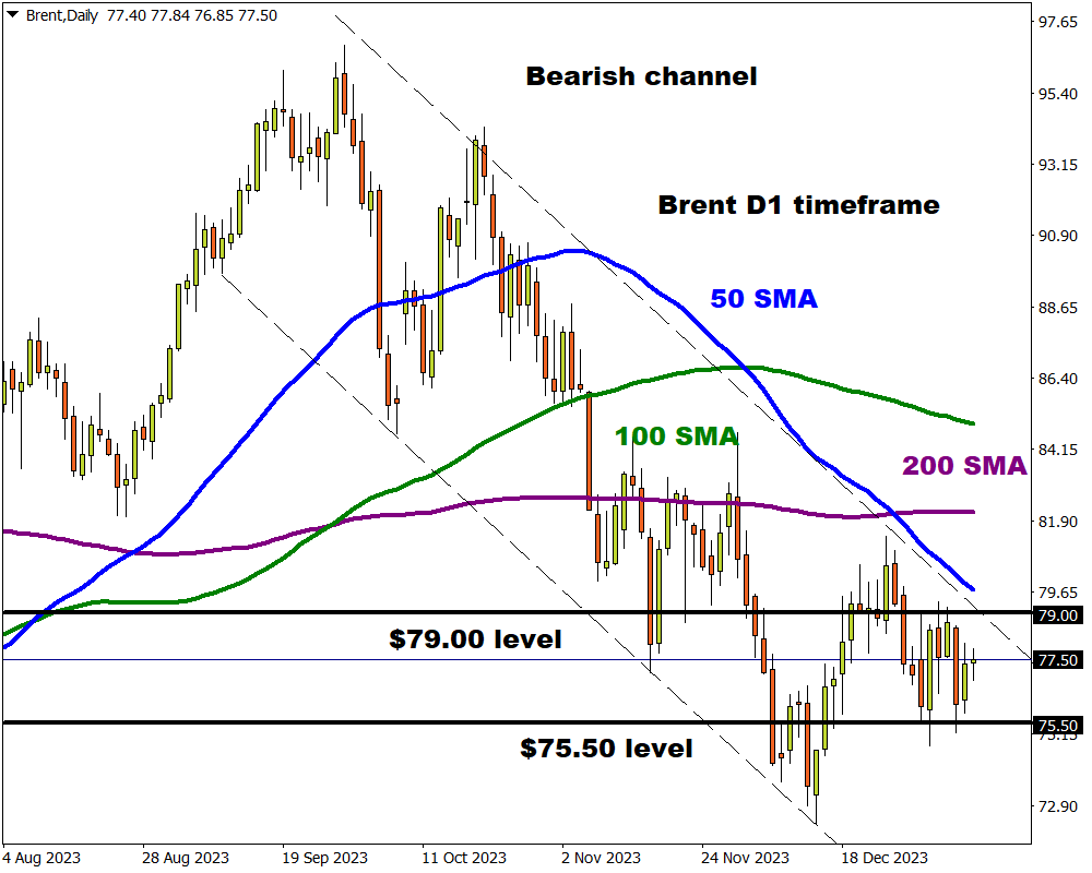 Prices are currently trapped within a range on the daily charts with support at $75.50 and resistance at $79.00.