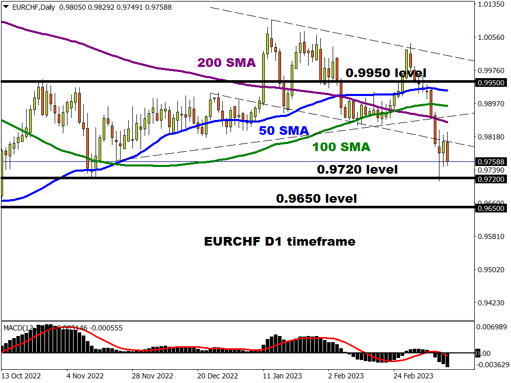 The risk-off sentiment has sent investors rushing to safety with the Swiss Franc gaining from the safe-haven flows. Price action suggests that bears remain in firm control with 0.9720 acting as a key level of interest. A breakdown below this point could encourage a decline toward 0.9650.