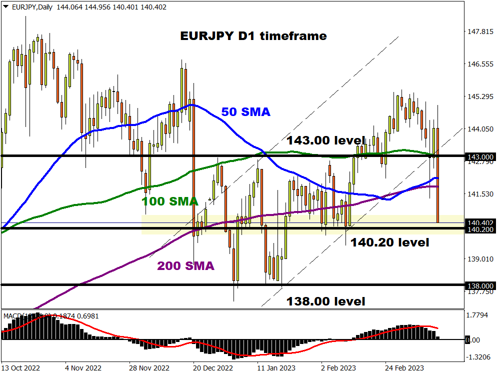 The EURJPY collapsed on Wednesday as prices cut through multiple levels of support like a hot knife through butter. Prices have tumbled over 400 pips, with bears eyeing support at 140.20. A strong breakdown below this point could open the doors towards 138.00. Should 140.20 prove to be reliable support, this could trigger a rebound back toward the 200-day SMA at 141.80.