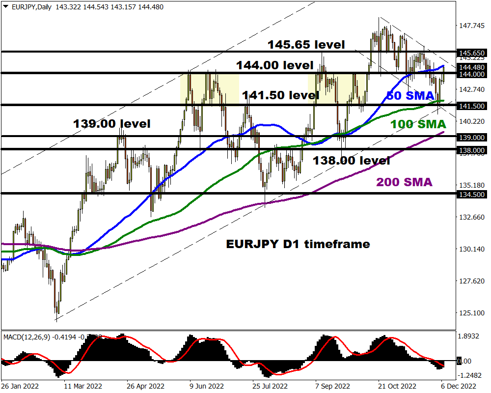 The EURJPY may be back on the rise after support was found above the 100-day SMA. Prices remain in a bullish trend despite periods of weakness with bulls breaking above 144.00. If the upside gains momentum, the next key level of interest can be found at 145.60. If bears re-enter the scene, the EURJPY could descend back towards 141.50.