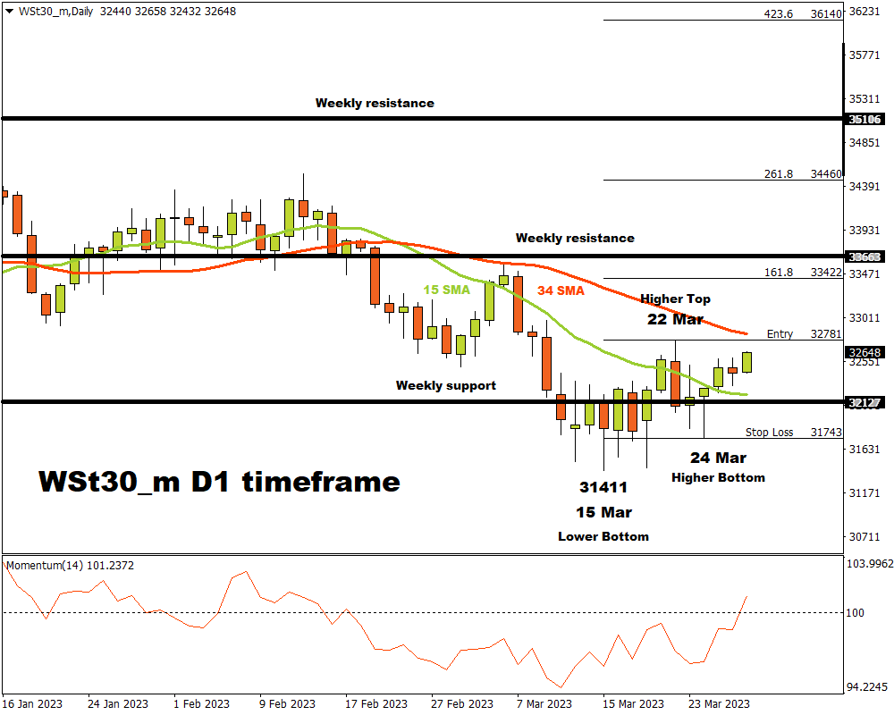 The WSt30 index on the D1 time frame started a new uptrend when the market structure changed after a last lower bottom formed at 31411 on 15 March. This happened inside a weekly support zone where the bulls found the price attractive and demand started increasing.