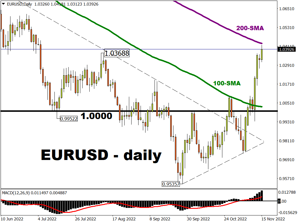 The world’s most popular currency pair broke out of this year’s long-term bear channel at the start of the month. It has popped up above the August high at 1.0368 this morning and is approaching resistance at the 200-day simple moving average at 1.0427.
