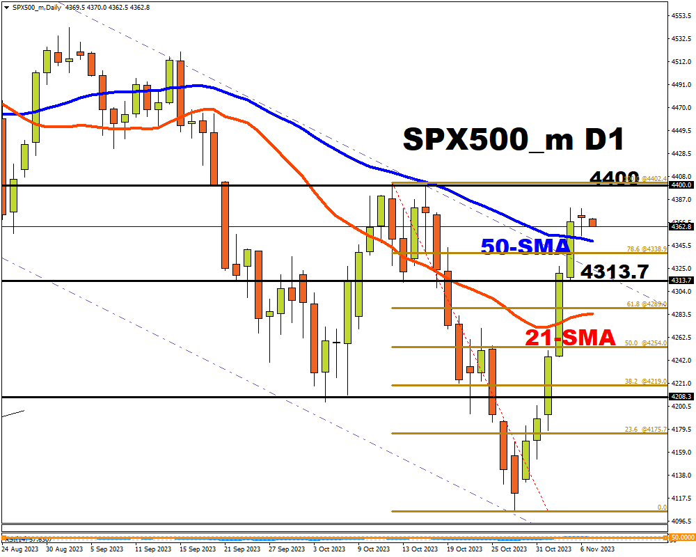 A failure to retest the support areas mentioned above, or a failure to hold a close below 4313.7, may see SPX500_m bulls aim for highs above 4400.