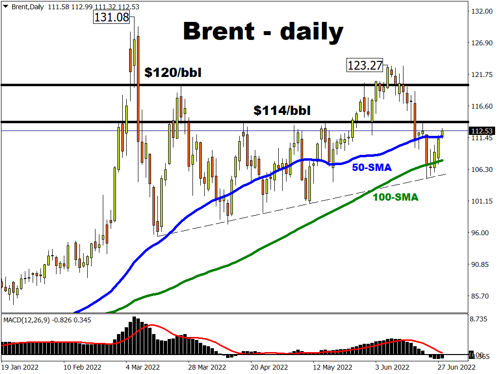 We are now trading just above the 50-day simple moving average at $111.64 with bulls eyeing up the $114 resistance level which had capped Brent prices for much of April-May.