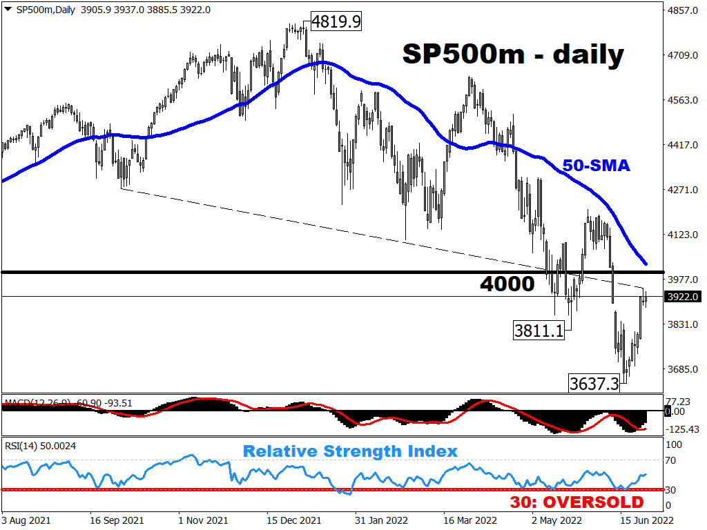 Prices were also oversold on the daily and weekly charts with the RSIs dipping towards 30. The rebound has taken us above the May low at 3811.1 and the bulls are now challenging trendline resistance from the October 2021 low.