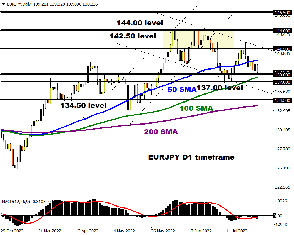 As the subtitle says, the EURJPY is experiencing lower lows and lower highs on the daily charts. Prices are trading below the 50, 100, and 200-day Simple Moving Average while the MACD trades below zero. A strong breakdown below 137.00 could pave a path back towards 134.50.