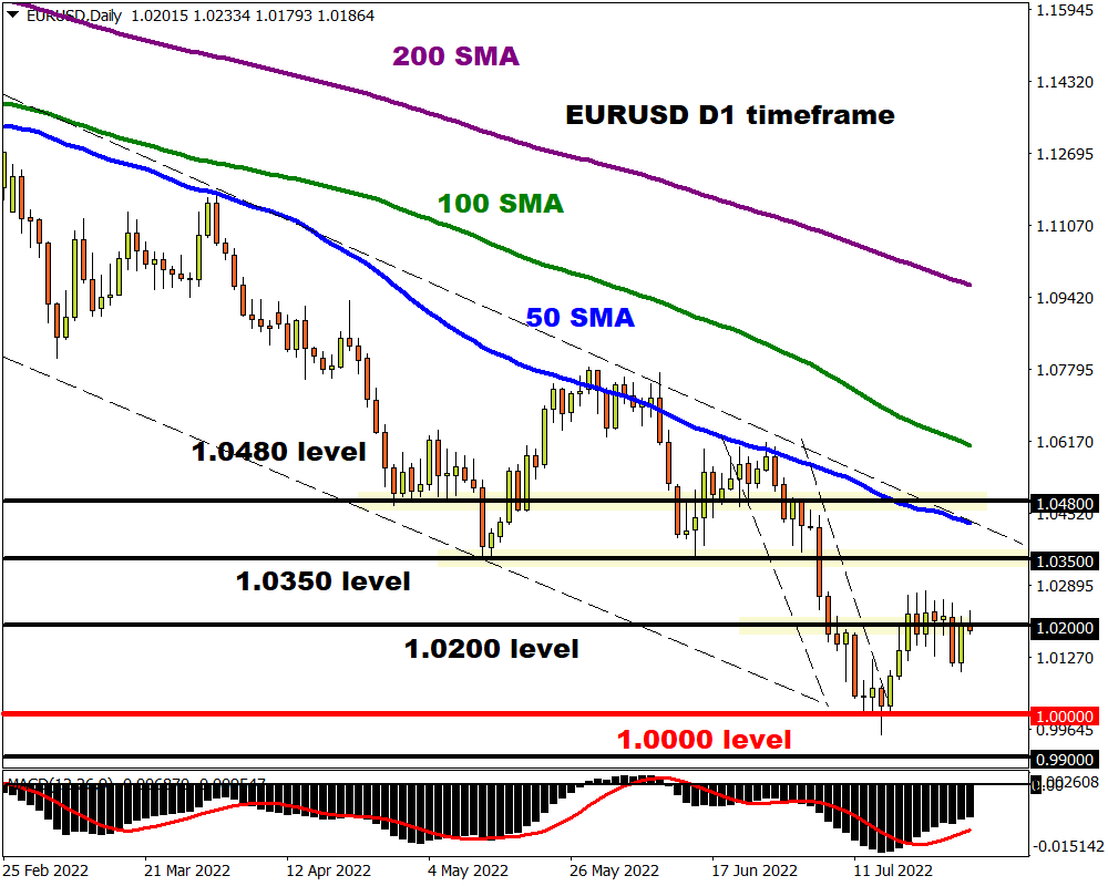 A weaker dollar could provide a lifeline for EURUSD bulls, keeping prices above parity for slightly longer before the fundamental forces eventually drag prices lower. There seems to be something about the sticky 1.0200 level which has acted as support and resistance over the past few days. A solid breakout and weekly close above this level could encourage a move higher towards 1.0350. Should prices fail to conquer 1.0200, a move back to parity could be on the cards.