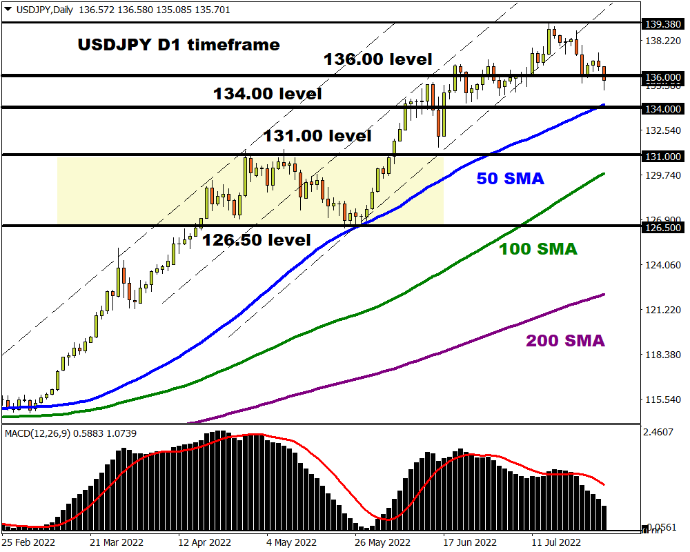 We see a potential breakdown opportunity on the USDJPY. Prices are trading below the 136.00 support level and could decline towards 134.00 which is above the 50-day Simple Moving Average. A strong breakdown below 134.00 could open the doors towards 131.00.