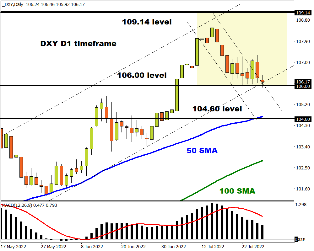 Taking a look at the technical picture, the Dollar Index (DXY) is under pressure on the daily charts with prices wobbling above 106.00. A breakdown below this level could signal the start of a bearish trend with 104.60 acting as the first target.