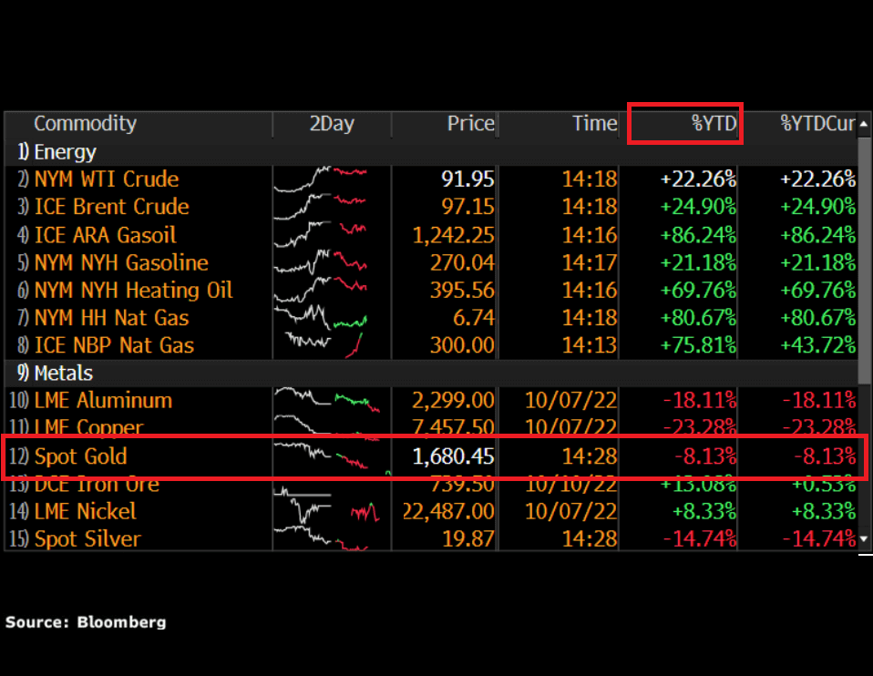 The precious metal is down over 8% year-to-date thanks to an appreciating dollar, rising Treasury yields, and expectations for aggressive interest rates enforced by central banks. Although geopolitical risks, periods of dollar weakness and global growth concerns have somewhat limited downside losses – bears are currently winning this war. According to Bloomberg, traders are pricing in a 92% of a 75-basis point rate hike at the next FOMC meeting in November. If such becomes reality, gold could be instore for more pain as 2022 slowly comes to an end.