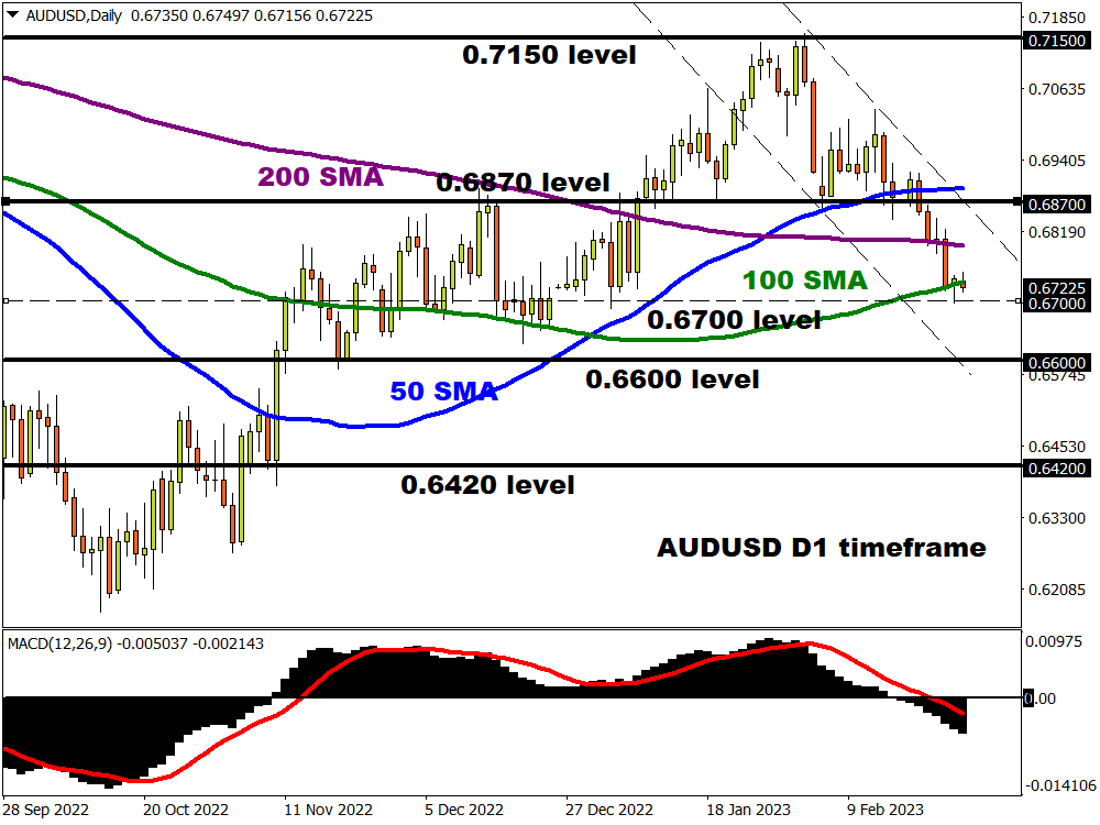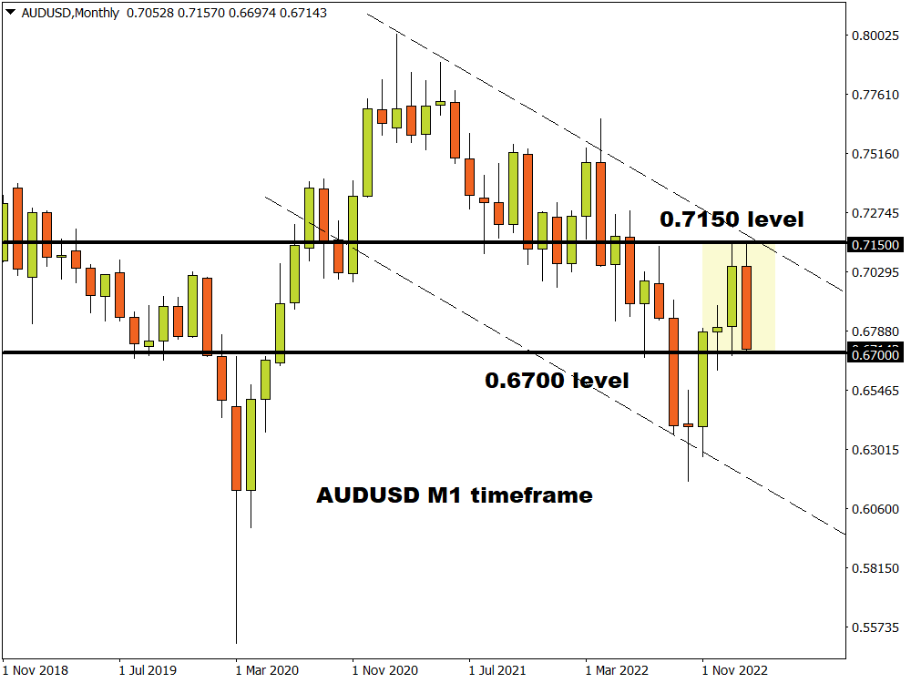 Taking a quick look at the technical picture, the AUDUSD remains under pressure on the monthly timeframe. The bearish engulfing candlestick formation signals further downside, with a strong bearish breakdown below 0.6700 opening the doors to lower levels.