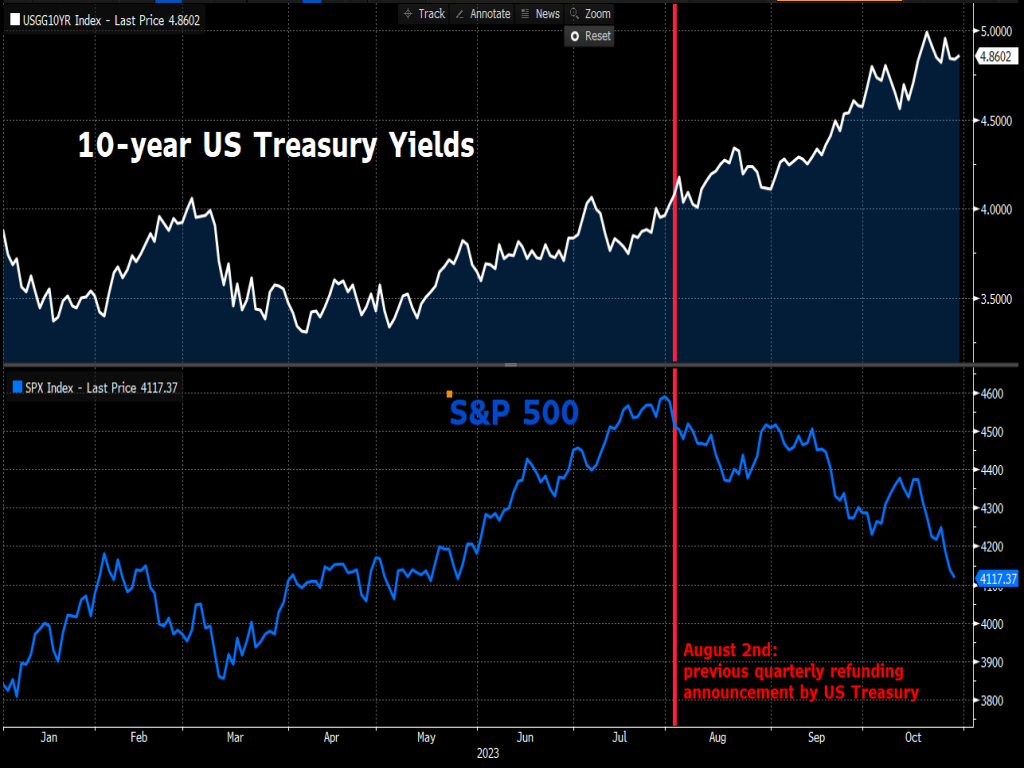 To underscores the sheer importance of this upcoming announcement for global markets, note how the prior quarterly refunding announcement on August 2nd sparked a rout in US bond markets, setting 10-year US Treasury yields on the way to hitting 5% for the first time since 2007!