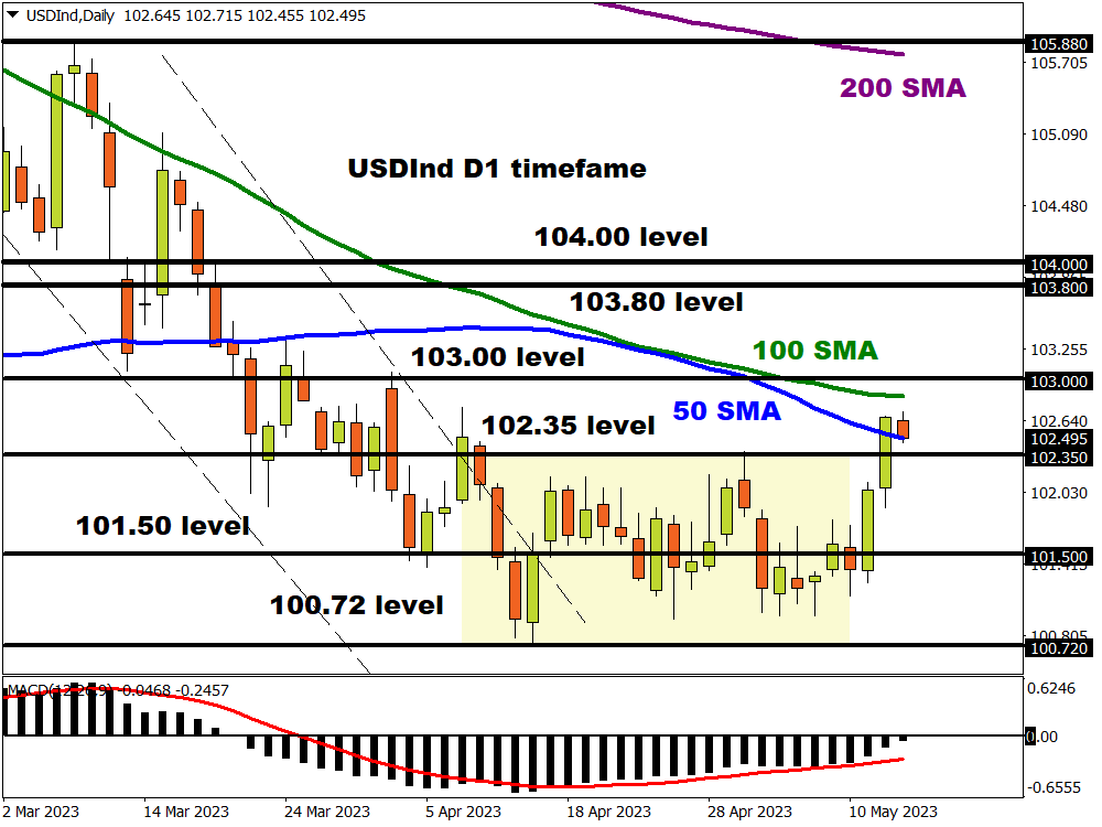 Nevertheless, the resistance around 50 and 100-day SMA could still weaken bulls before prices test the 103.00 level. Should prices push above this point, the next key level of interest on the US Dollar Index can be found at around 103.80 and 104.00. Alternatively, a decline back under 102.35 could signal a selloff towards 101.50 and 100.72, respectively.