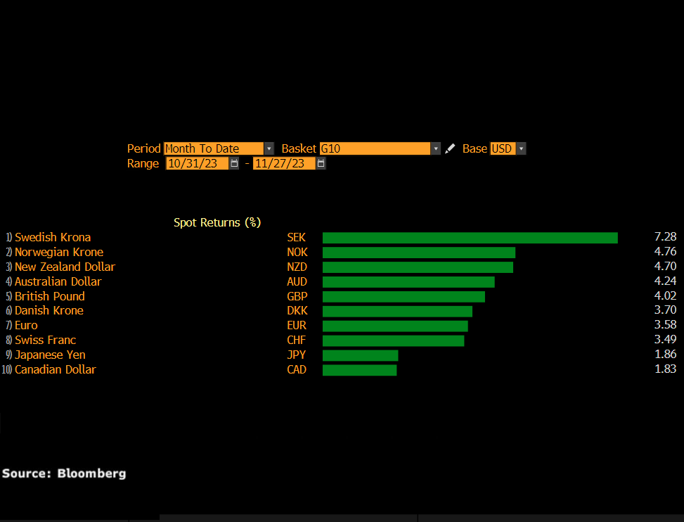 Data such as third-quarter US GDP (second estimate), consumer confidence, the latest PCE report and PMI’s among others may offer fresh clues about the Fed’s 2024 policy outlook. On Friday, Powell will be under the spotlight with his comments heavily scrutinized by investors for more clarity on the Fed’s thinking beyond 2023.