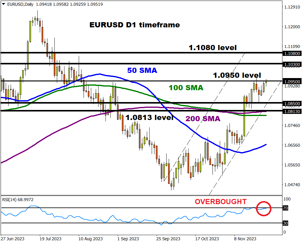 The EURUSD remains in a healthy uptrend on the daily charts as there have been consistently higher highs and higher lows. Although euro bulls are in a position of power above the 200-day SMA, the Relative Strength Index (RSI) has touched 70 - indicating that prices may be overbought. A strong breakout or technical rebound could be on the horizon, with 1.0950 acting as a key level of interest.