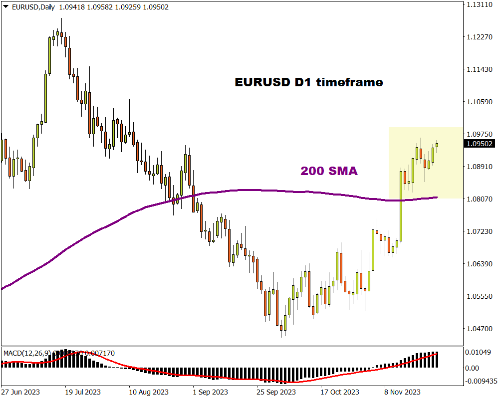 - The dollar is likely to strengthen if economic data beats forecasts and Powell downplays expectations around US rate cuts next year. A stronger dollar may drag the EURUSD’s lower.