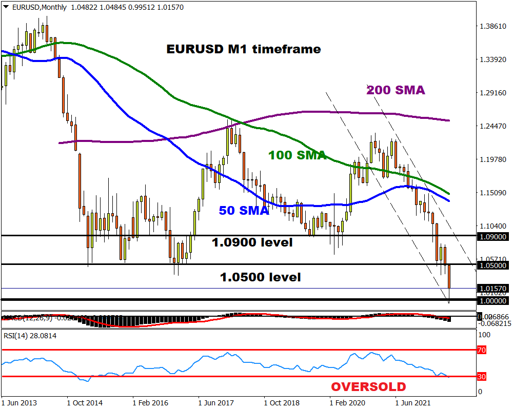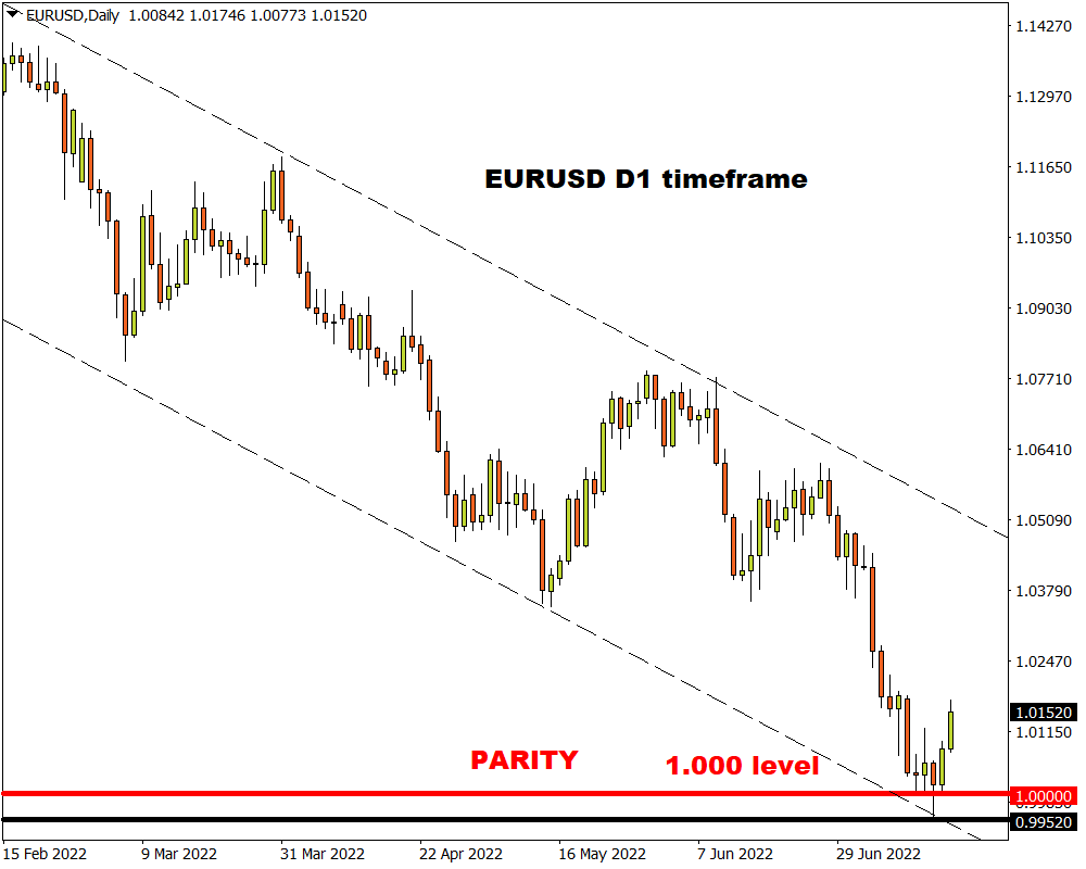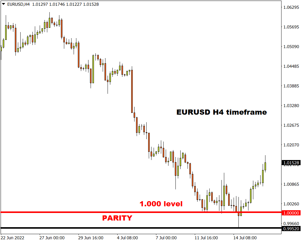 Without digging too deep into the derivative markets, the reason why the EURUSD was initially hesitant to break 1.000 was based on options. To add more colour, imagine the EURUSD being defended at parity by traders doing everything in their power from having to pay on financial contracts if the level is crossed. For more information on options please click here.