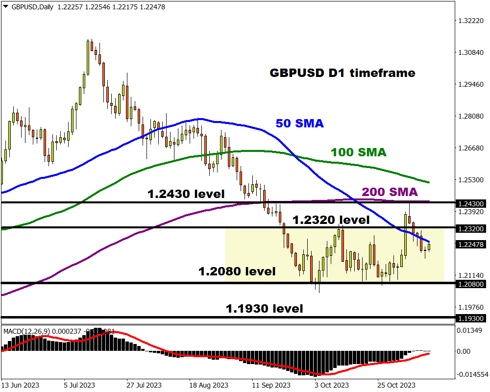 The GBPUSD has been stuck within this range since late September with key support at 1.2080.