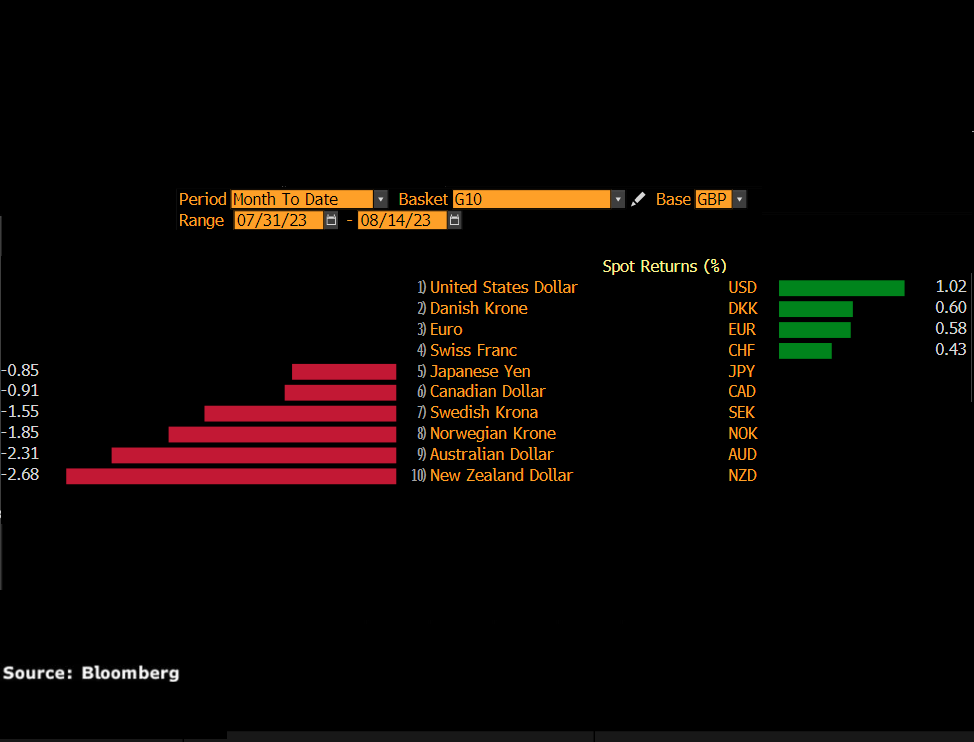 The British Pound has appreciated against most G10 currencies since the start of August.