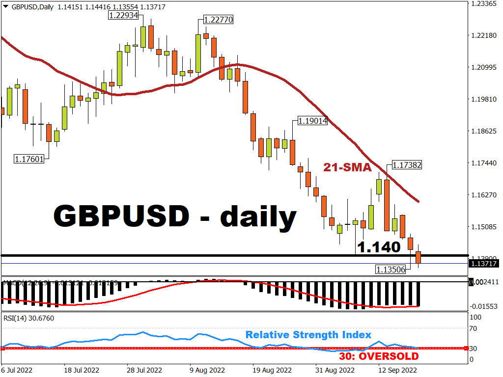 From a technical perspective, GBPUSD appears due for a technical rebound, seeing as its 14-day relative strength index is on the cusp of breaking below the 30 threshold that denotes ‘oversold’ conditions (refer to above chart)