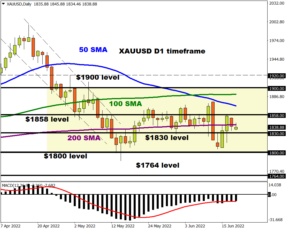 On the daily timeframe, gold prices are trading below the 50, 100, and 200 SMA while the MACD trades below zero. There seems to be minor support around $1830. A solid breakdown below this level could encourage a decline towards $1800 and $1764. A breakout above $1858 could trigger a move higher towards $1870 and $1900, respectively. Beyond $1900, the first checkpoint can be found at $1920.