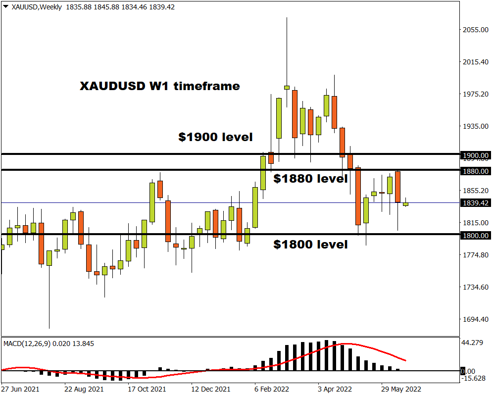 Since the start of Q2, gold has shed roughly 5% but is up 0.5% year-to-date. As highlighted earlier, ongoing geopolitical risks, soaring inflation, global growth concerns, the dollar, Treasury yields, and Fed hike expectations have influenced gold prices. After securing a weekly close below $1900 back in April, could the precious metal be gearing for a breakout/down from its current range?