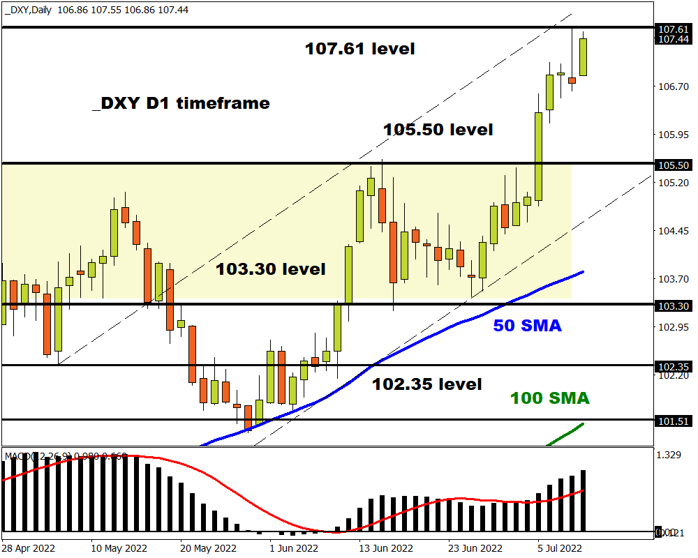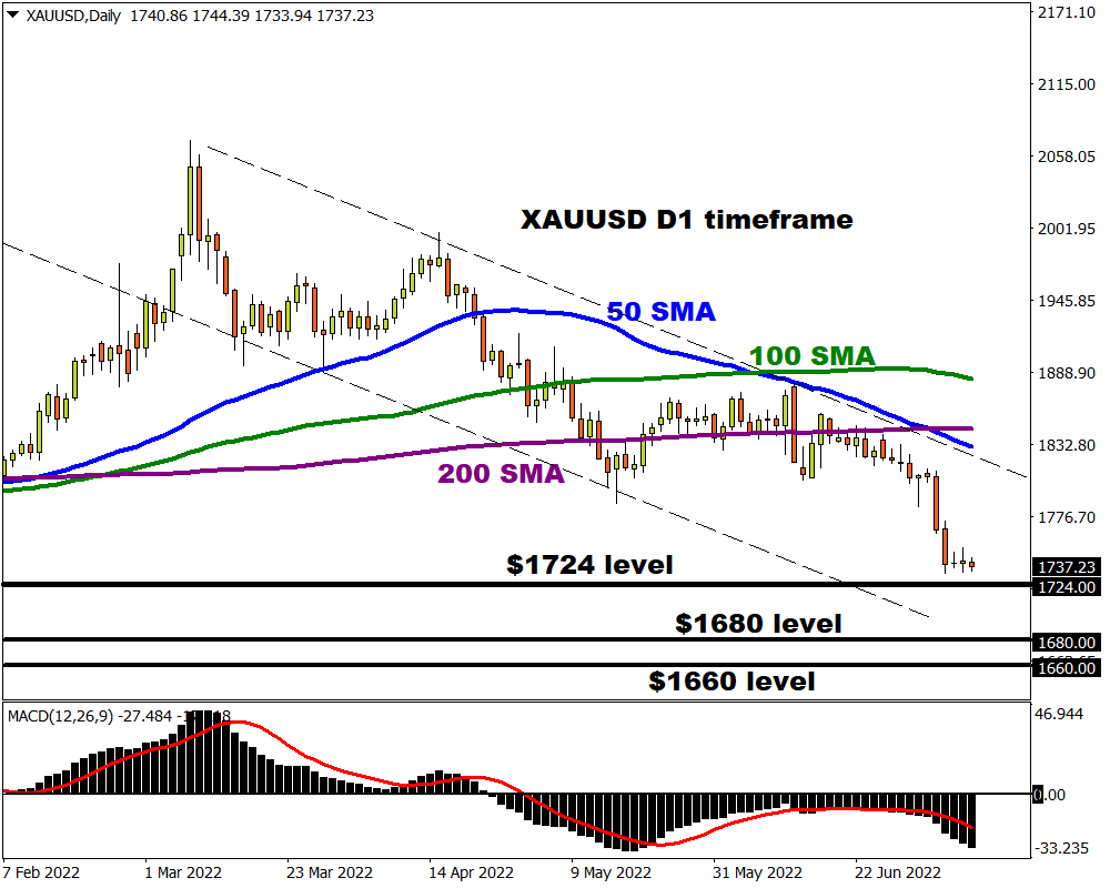 Wednesday sees the release of the US inflation report with investors watching anxiously to see if prices are rising again or perhaps that we are finally peaking. According to a poll by Bloomberg, inflation is expected to rise 8.8% year-on-year in June compared with 8.6% in May. If expectations meet reality, this would mark the fastest increase in consumer prices since the 8.9% figure back in December 1981! Such a development will most likely reinforce market bets of more aggressive Fed rate hikes – ultimately smothering investor appetite for gold as the dollar and Treasury yields rise.