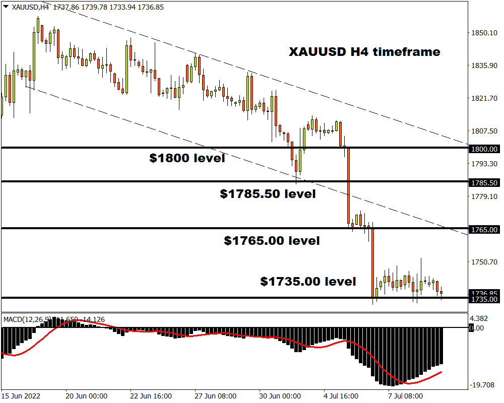The week ahead could be volatile for gold thanks to key economic data and risk events. Looking at the technical picture, bears are clearly in a position of power on the H4 and daily timeframe with prices shaking above $1735 as of writing. Given how the fundamentals are weighing heavily on the precious metal, bulls could find it difficult to fight back in the short to medium term.