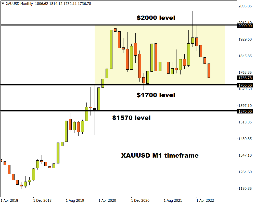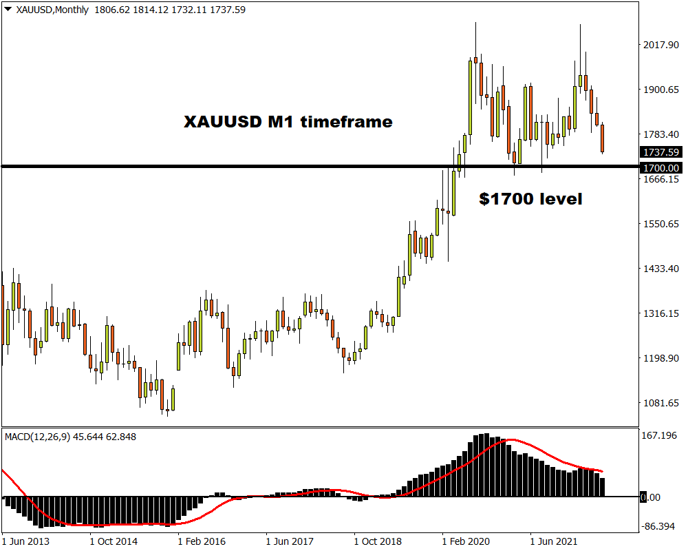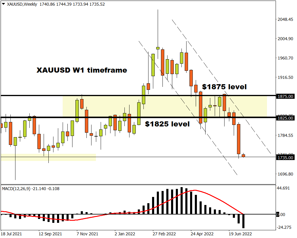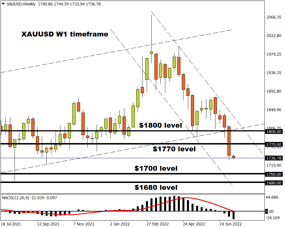After securing a solid weekly close below the $1825 level back in late June, bears were injected with fresh inspiration as various fundamental forces fuelled the downside momentum. The precious metal is down almost 4% this month with prices trading at levels not seen since September 2021!