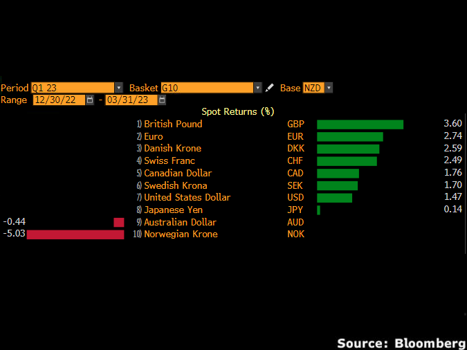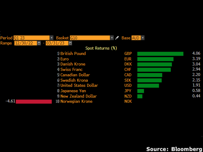 Investors will be served a central bank combo this week featuring the Reserve Bank of Australia (RBA) and Reserve Bank of New Zealand (RBNZ). There are mixed expectations over what to expect from the RBA while the RBNZ is expected to hike rates by 25 basis points. But before we take a deep dive into how the pending central bank decisions could play out, it is worth keeping in mind that the aussie weakened against most G10 currencies in Q1 2023.