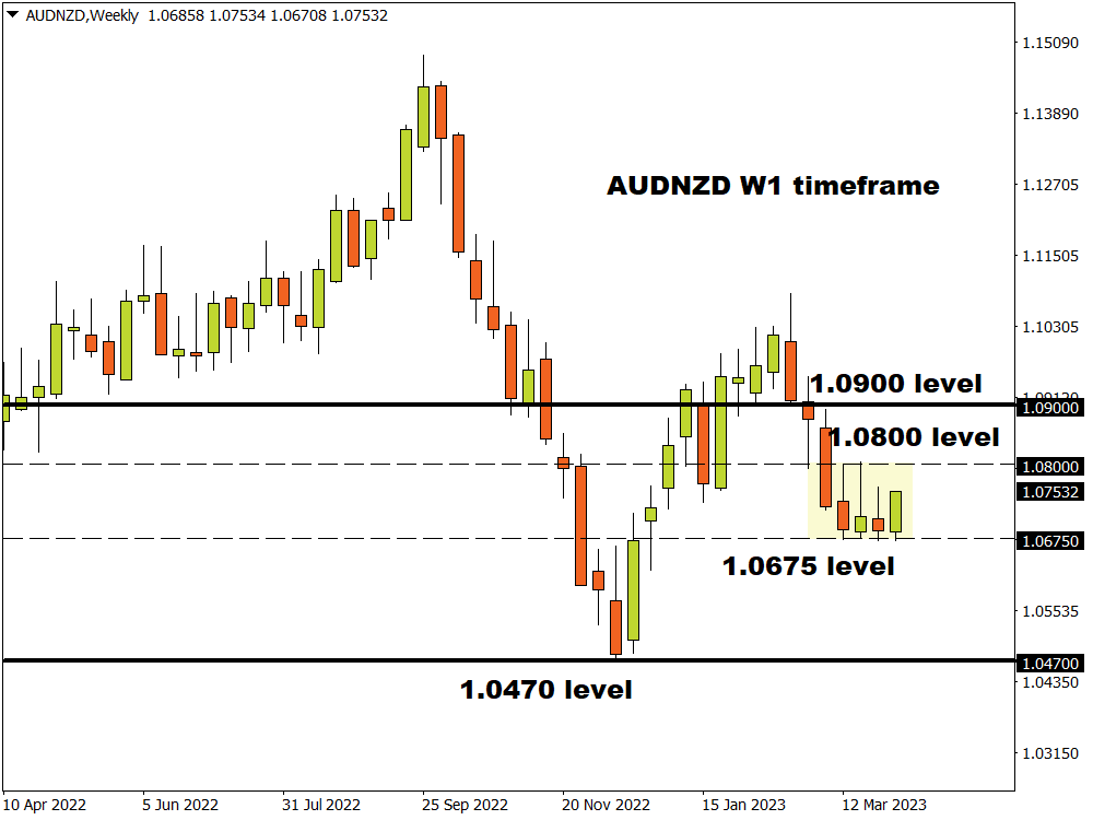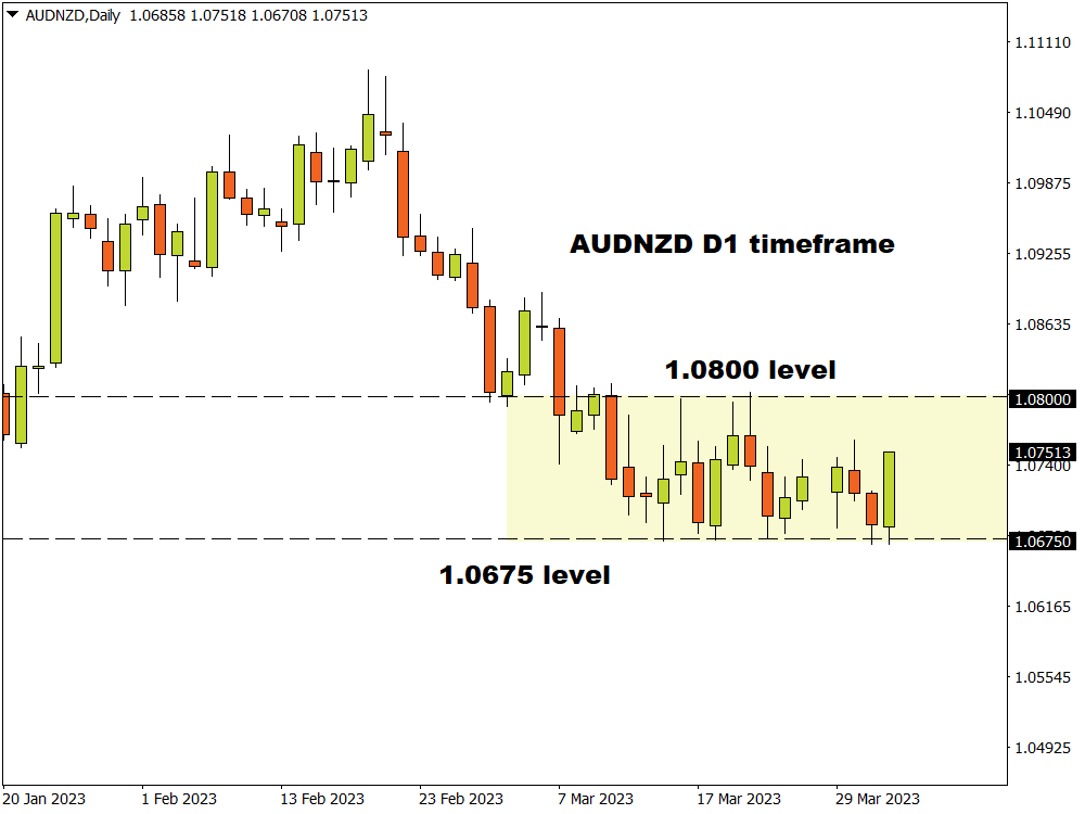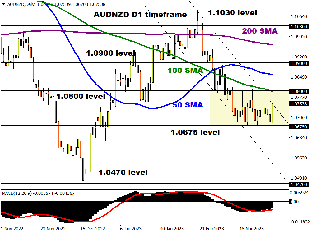 The AUDNZD has been trapped within a range since early March. On the daily timeframe, prices are trading below the 50, 100, and 200-day Simple Moving Average (SMA) while the MACD trades below zero. Zooming out on the weekly charts, the trend is turning bearish thanks to the consistent lower lows and lower highs. However, the support at 1.0675 has halted bears in their tracks for the past four weeks.