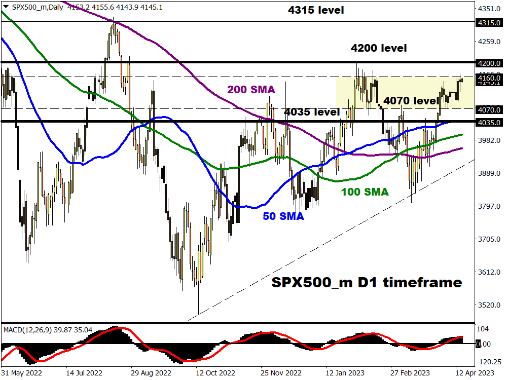 As highlighted earlier, the SPX500_m could be gearing for a major breakout on the daily timeframe. Although the overall trend looks to be bullish, it may take a potent fundamental spark to conquer the 4160 resistance which was last tested in February 2023. A solid breakout above this point could encourage an incline towards 4200 and levels not seen since August 2022 around 4315. Alternatively, should 4160 prove to be a tough nut to crack, this may open the doors back toward 4070 and 4035 – where the 50-say SMA resides.
