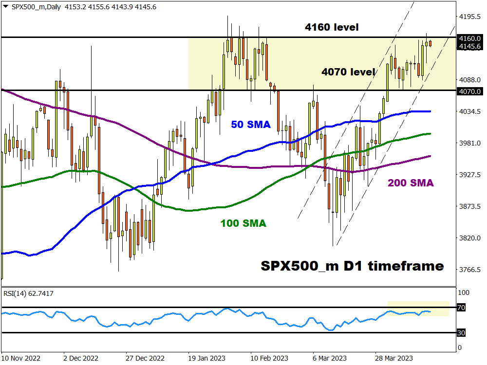 Taking a brief look at the technical picture, prices remain in an uptrend despite the period of consolidation with support at 4070 and resistance at 4160. Although the index is trading comfortably above the 50,100 and 200-day SMA, the Relative Strength Index (RSI) signals that prices are flirting near overbought conditions.