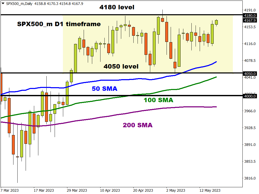 - Looking at the technicals, the SPX500 remains in a wide range with support at 4050 and resistance at 4180.