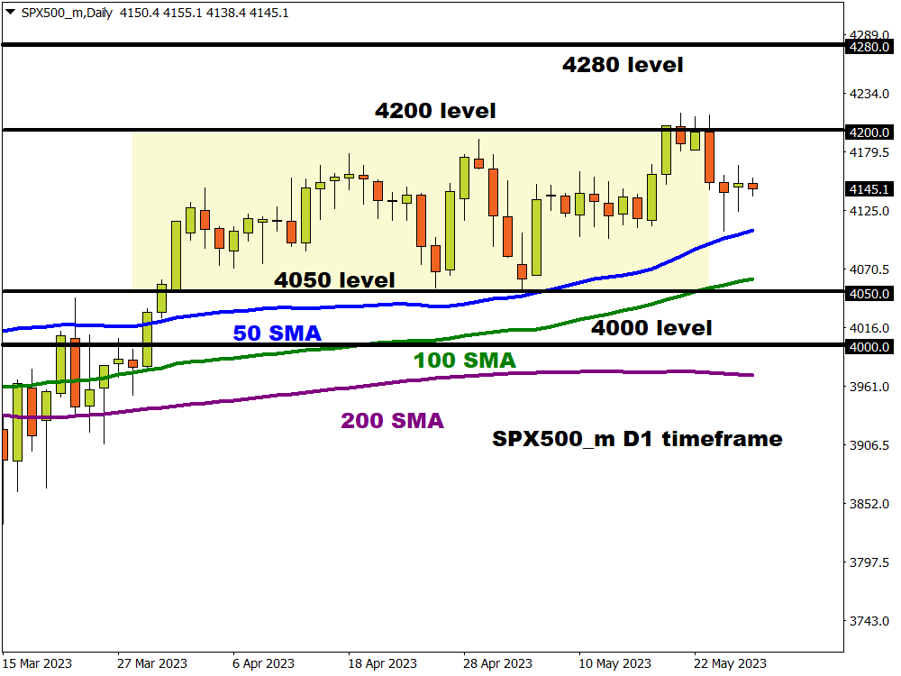 - If a deal is reached before Yellen’s June 1st, investors may acquire an aggressive appetite for risk as relief sweeps across global markets. This may propel the SPX500_m towards the 4200 level and beyond.
