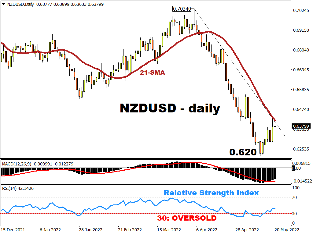 NZDUSD was able to clamber away from its two-year low close to 0.620, only to be resisted by its 21-day simple moving average as well as its downtrend line that began since April.