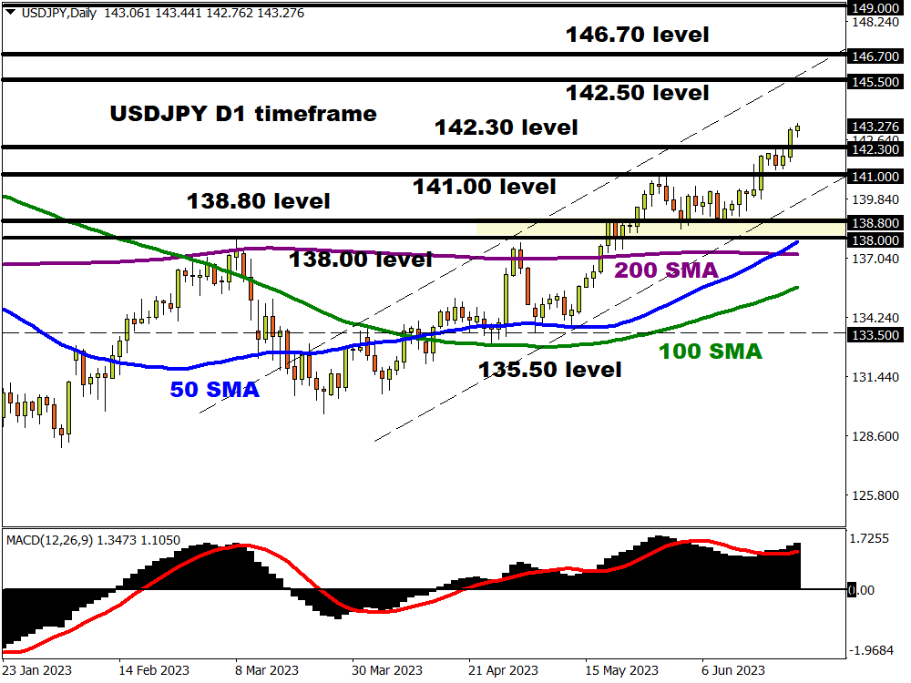 Talking technicals, the USDJPY remains firmly bullish on the daily charts. The recent breakout and daily close above 142.30 may open a path toward 145.50 and 146.70. Should prices slip back below 142.30, bears may target 141.00 and 138.80.