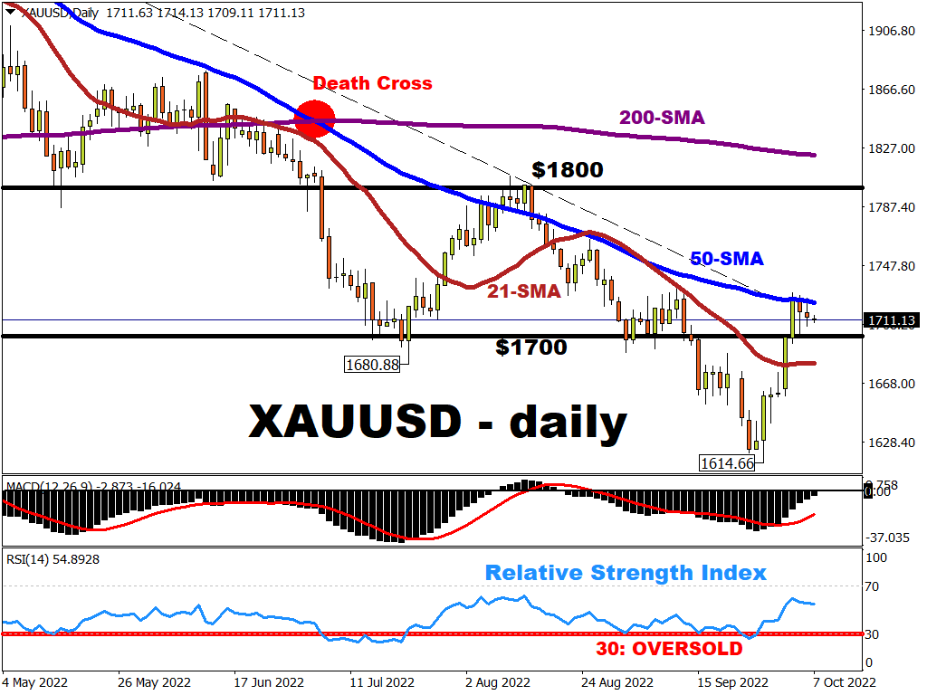 At the time of writing, although gold has managed to clamber back above the psychologically-important $1700 mark, prices have been resisted at the 50-day simple moving average (SMA) and have since eased slightly.