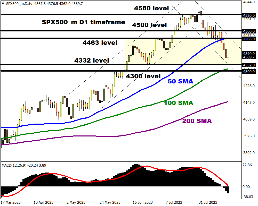Bears are capitalising on China's woes and fears surrounding a hawkish Federal Reserve. The SPX500_m looks to be in the early stages of a downtrend on the daily charts, with the potential for further losses if key support is breached.