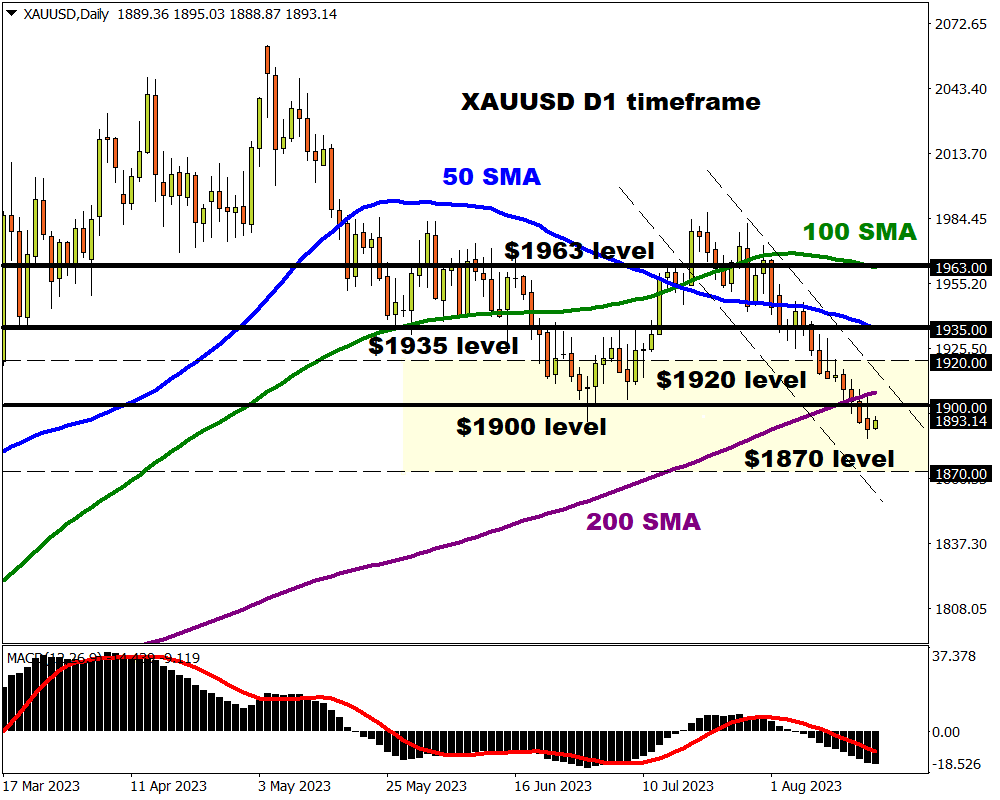 - Gold prices could sink towards $1870 if Powell strikes a firmly hawkish tone during his speech, fuelling bets around US rates remaining higher for longer.