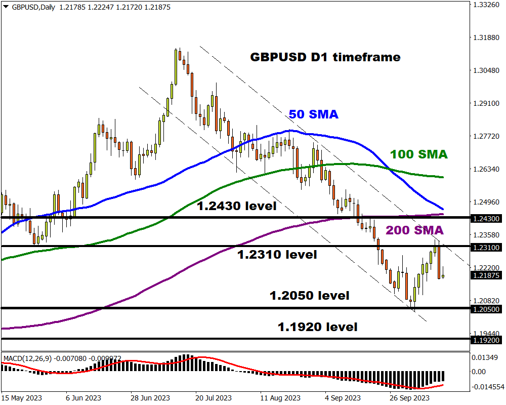 - Signs of still stubborn inflation may boost bets around the BoE hiking rates one more time before the end of 2023, pushing the GBPUSD towards 1.2310.