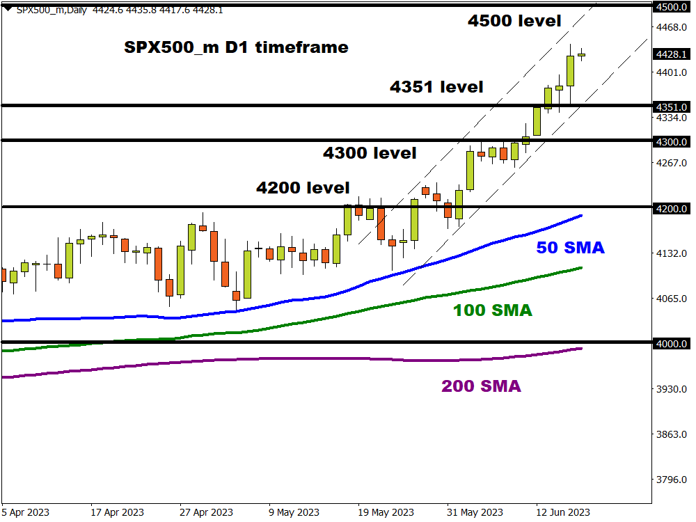 - The SPX500_m could extend gains towards 4500 in the coming week if Powell sounds cautious and expresses concerns over the US economic outlook.
