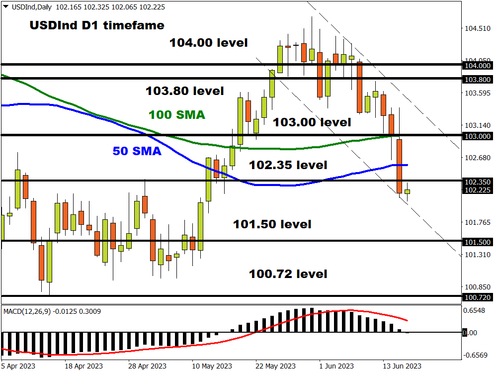 - The dollar could weaken further if Powell strikes a cautious tone during Testimony, which could drag prices toward 101.50 and 100.72, respectively.
