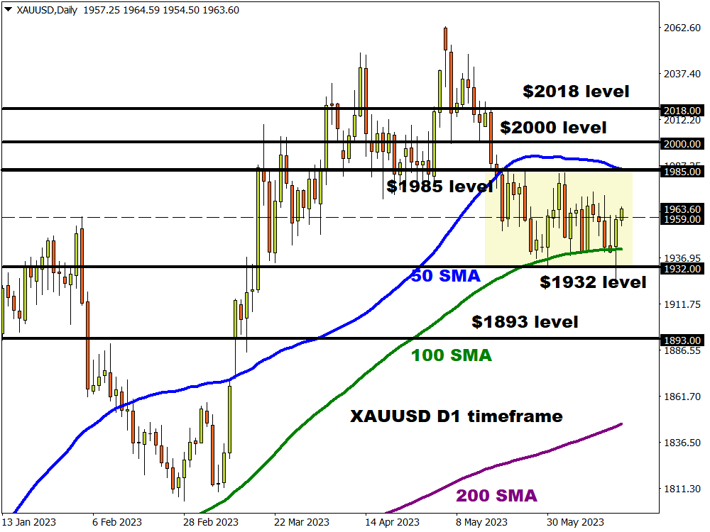 Gold still remains trapped within a range with support at $1932 and resistance at $1985. A potent fundamental spark may be required for prices to experience a decisive breakout.