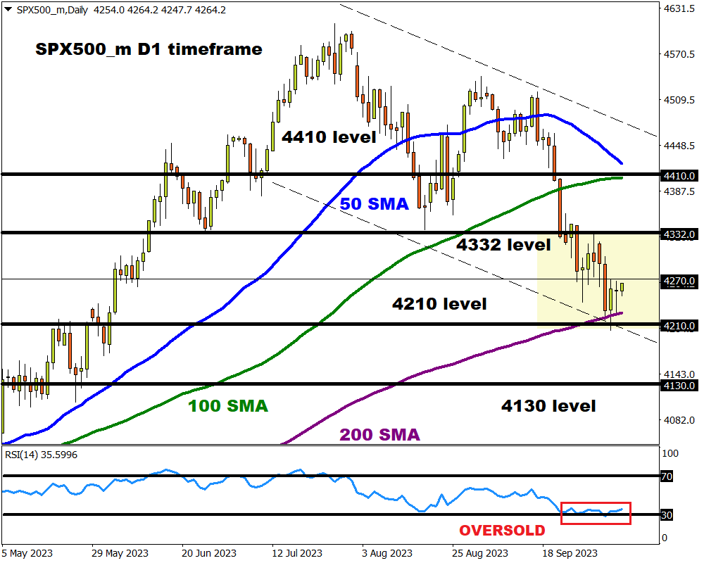 The SPX500_m remains in a bearish trend on the daily charts as there have been consistently lower lows and lower highs. However, strong support can be found just above the 200-day SMA with the Relative Strength Index (RSI) flirting around oversold territory – suggesting a potential pullback down the road. These conflicting signals may keep the SPX500_m trapped within a range until a fresh fundamental catalyst triggers a breakout. In the meantime, support can be found at 4210 and resistance at 4332.