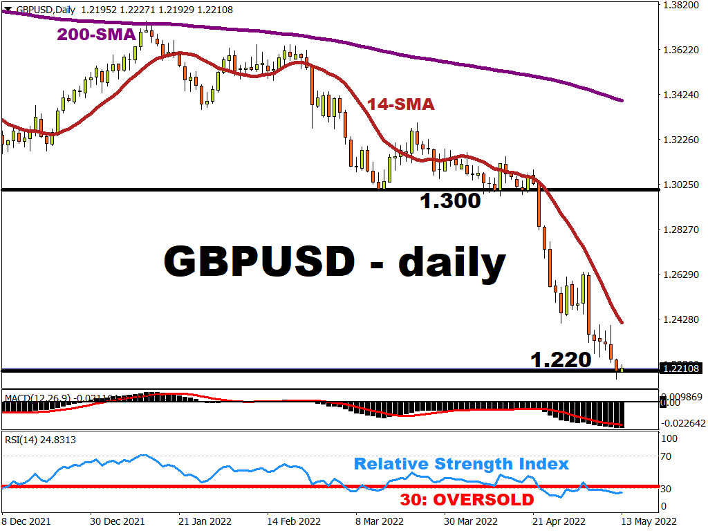 Although GBPUSD's 14-day relative strength index has broken below the 30 threshold that denotes oversold conditions, any recovery should prove fleeting, as long as the UK economic data suggests that a recession is inevitable and binds the BOE's hawkish hands, all while the Fed presses ahead with rate hikes galore.