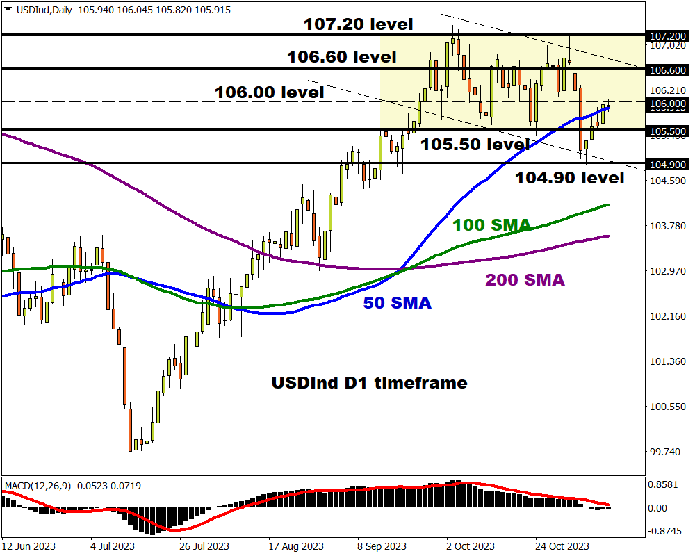 - Sustained weakness below the 50-day SMA (106.0 level) may encourage a decline back towards 105.50 and 104.90.