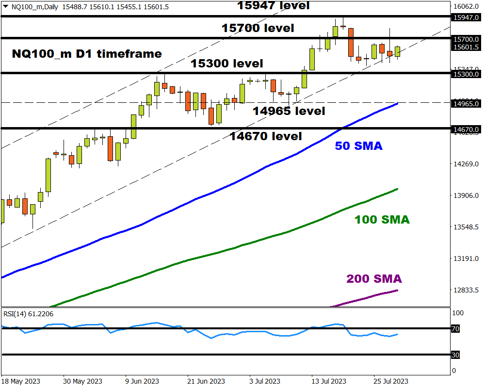 - A stronger than expected US jobs report is seen boosting expectations around Fed hike down the line. Such an outcome could see the NQ100_m slip back below the 15300-support level.
