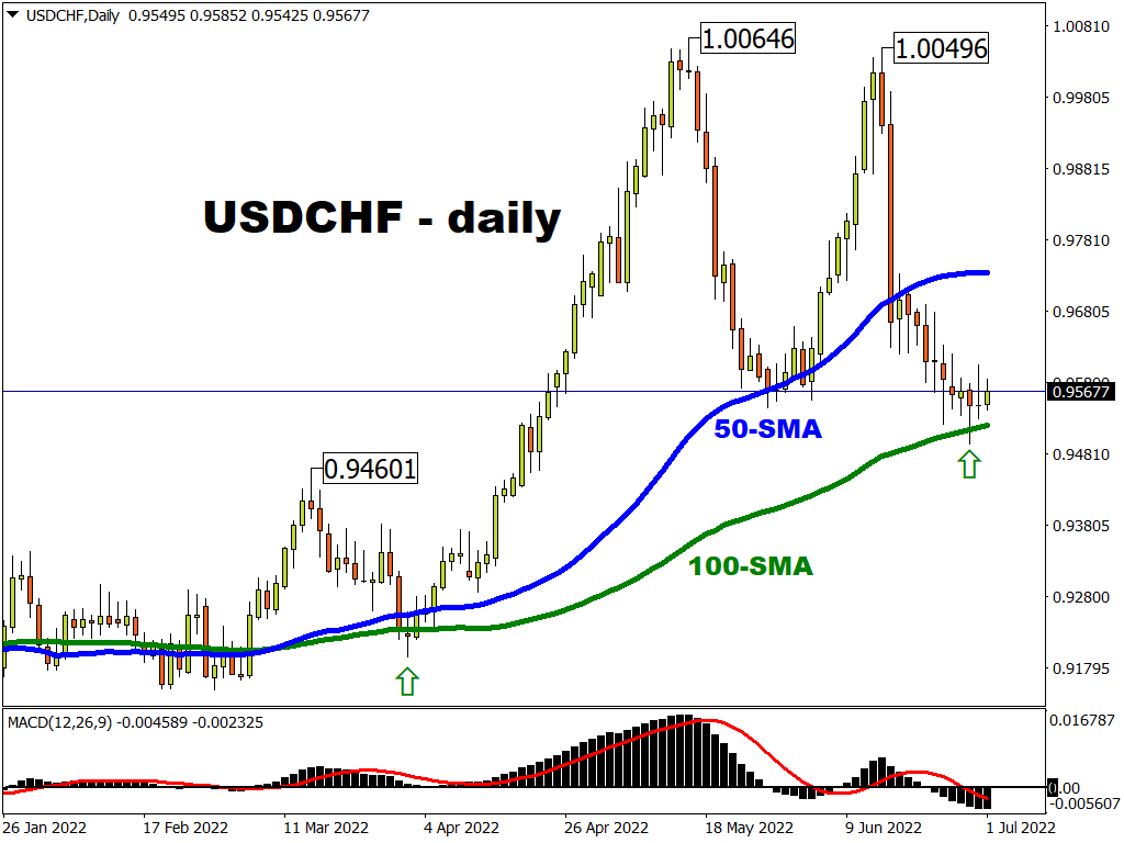 Looking at the charts, USDCHF has found support at its 100-day simple moving average on a couple of occasions over the past 3 months.